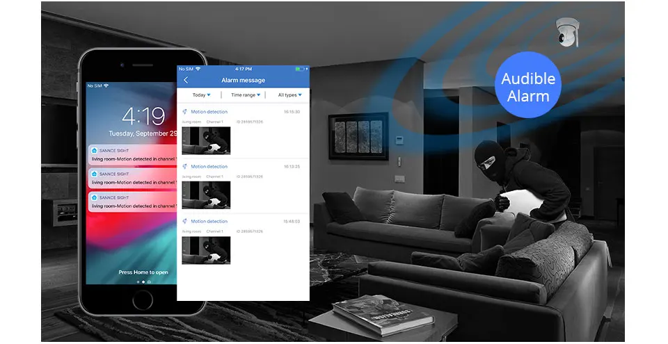 Avvisi istantanei e Sirena Una volta che la macchina fotografica cattura motion eventi, la smart camera attiva la sirena per scoraggiare gli intrusi e invia avvisi istantanei e app spinge, in modo da poter sapere ciò che sta accadendo e prendere la corretta azioni immediatamente.