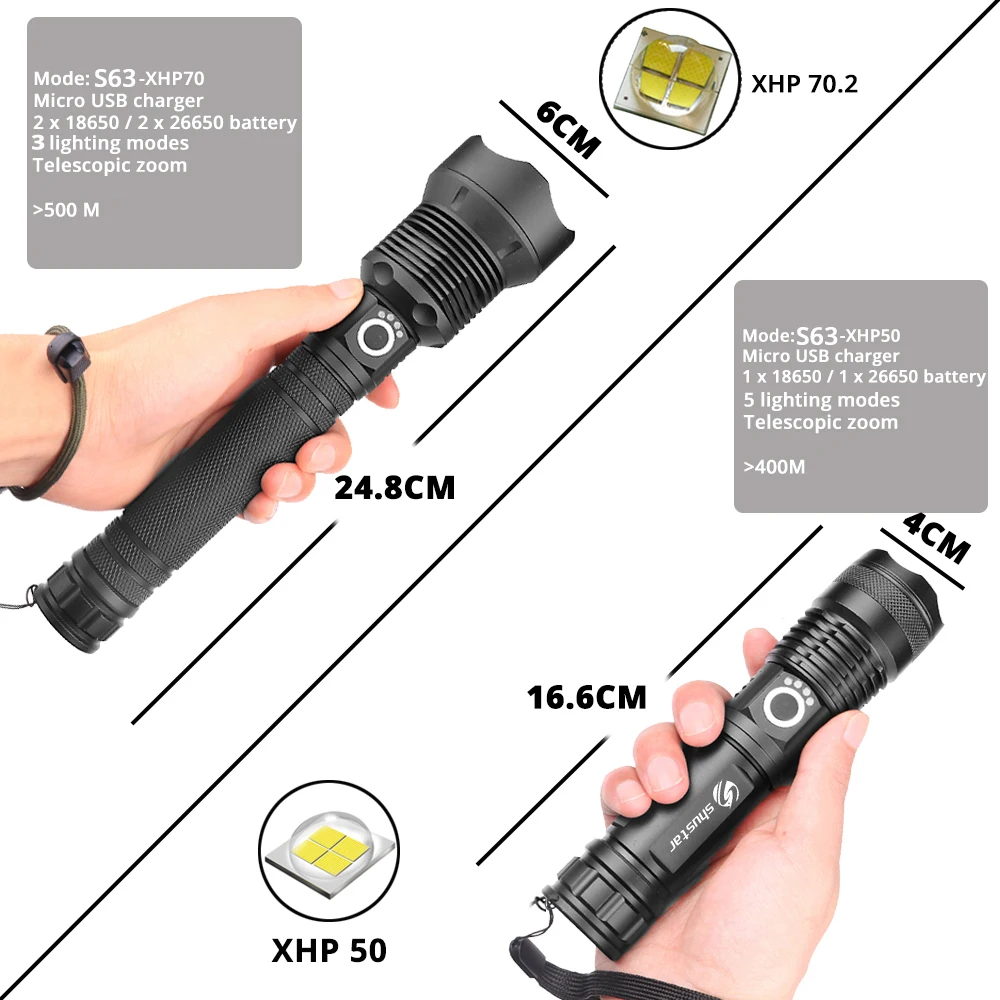 Materiale: T6063-T6 di alluminio di aeronautica XHP70.2 e XHP50 LED Della Lampada Della Torcia Differenza
