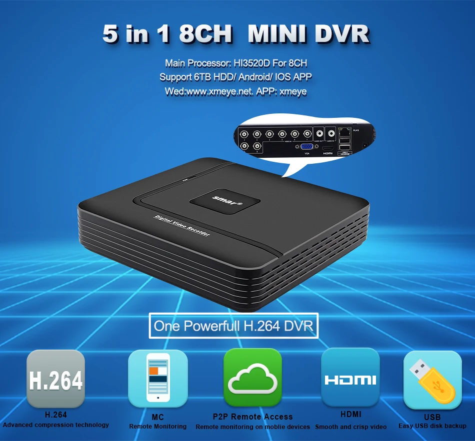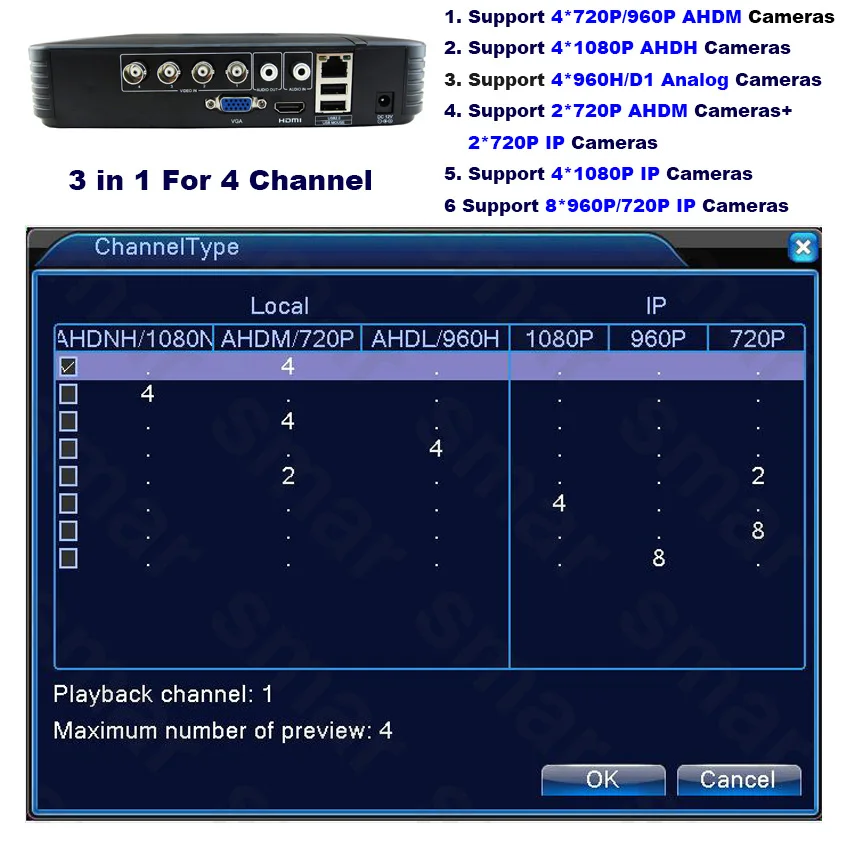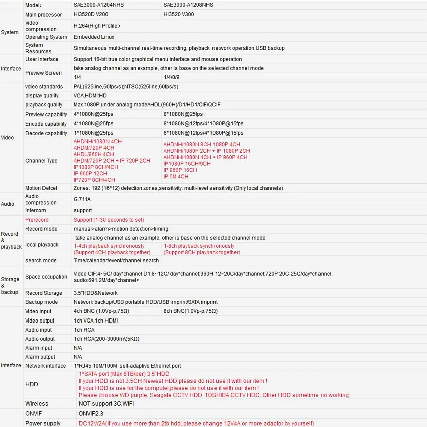 Specifiche per 4CH/8CH1 * Mini AHD(AHD-M) DVRNon includere HDD, il supporto 3.5 "SATA HDD ,Max supporto 1*6TB HDD.